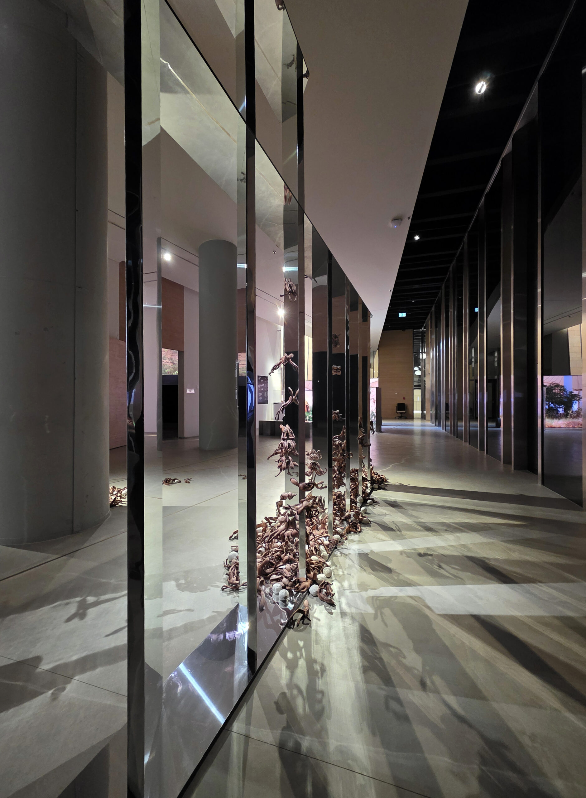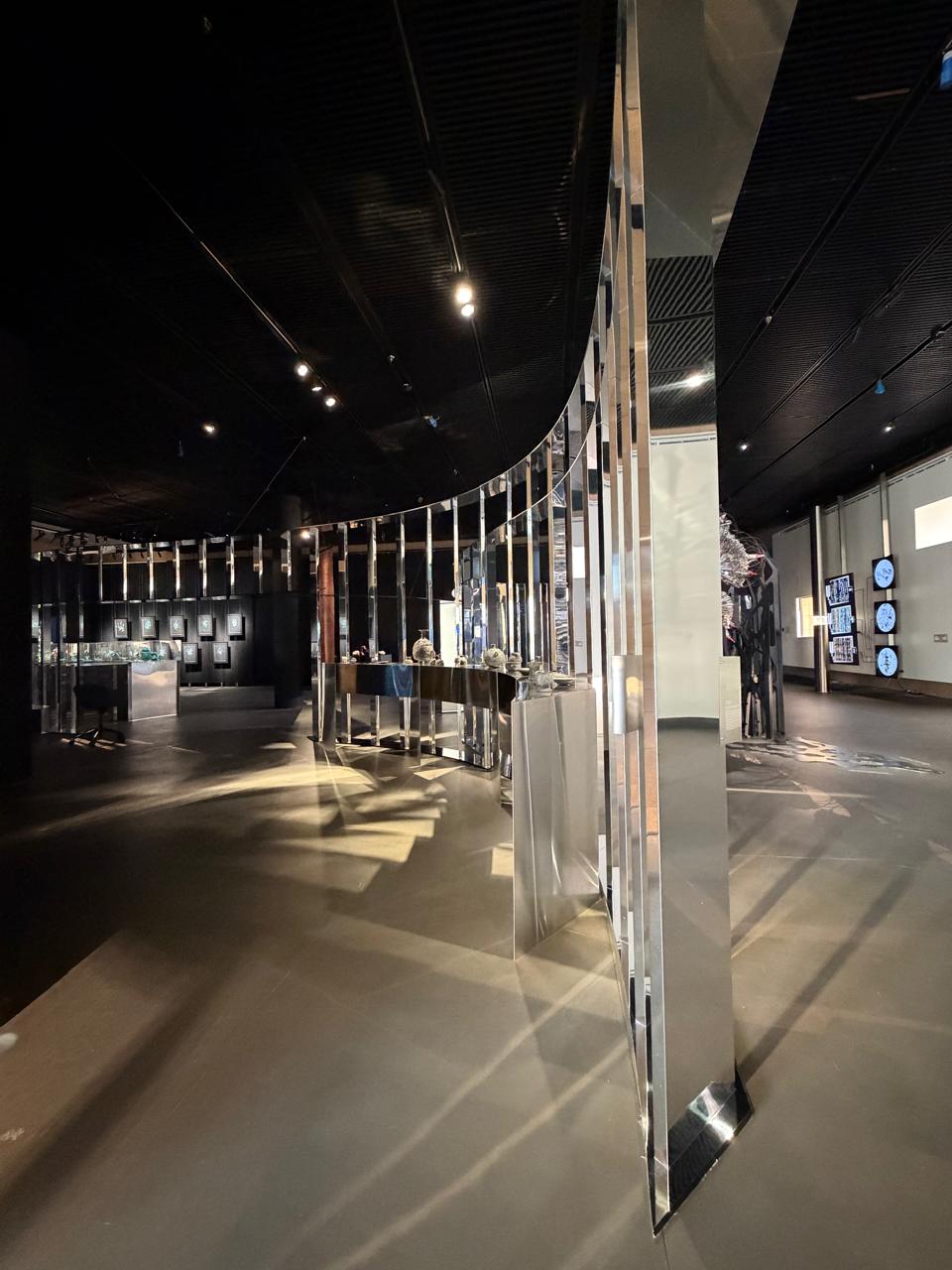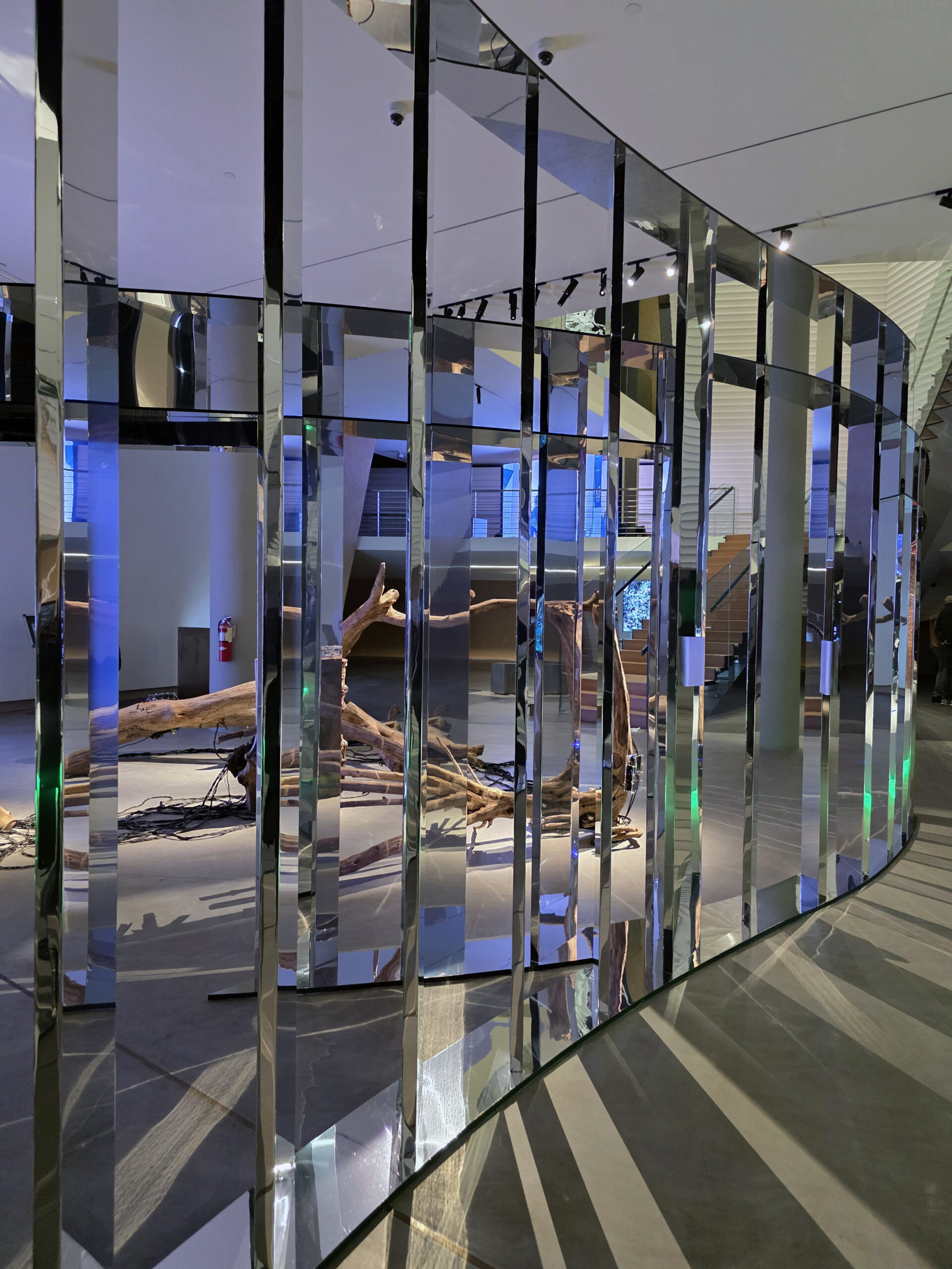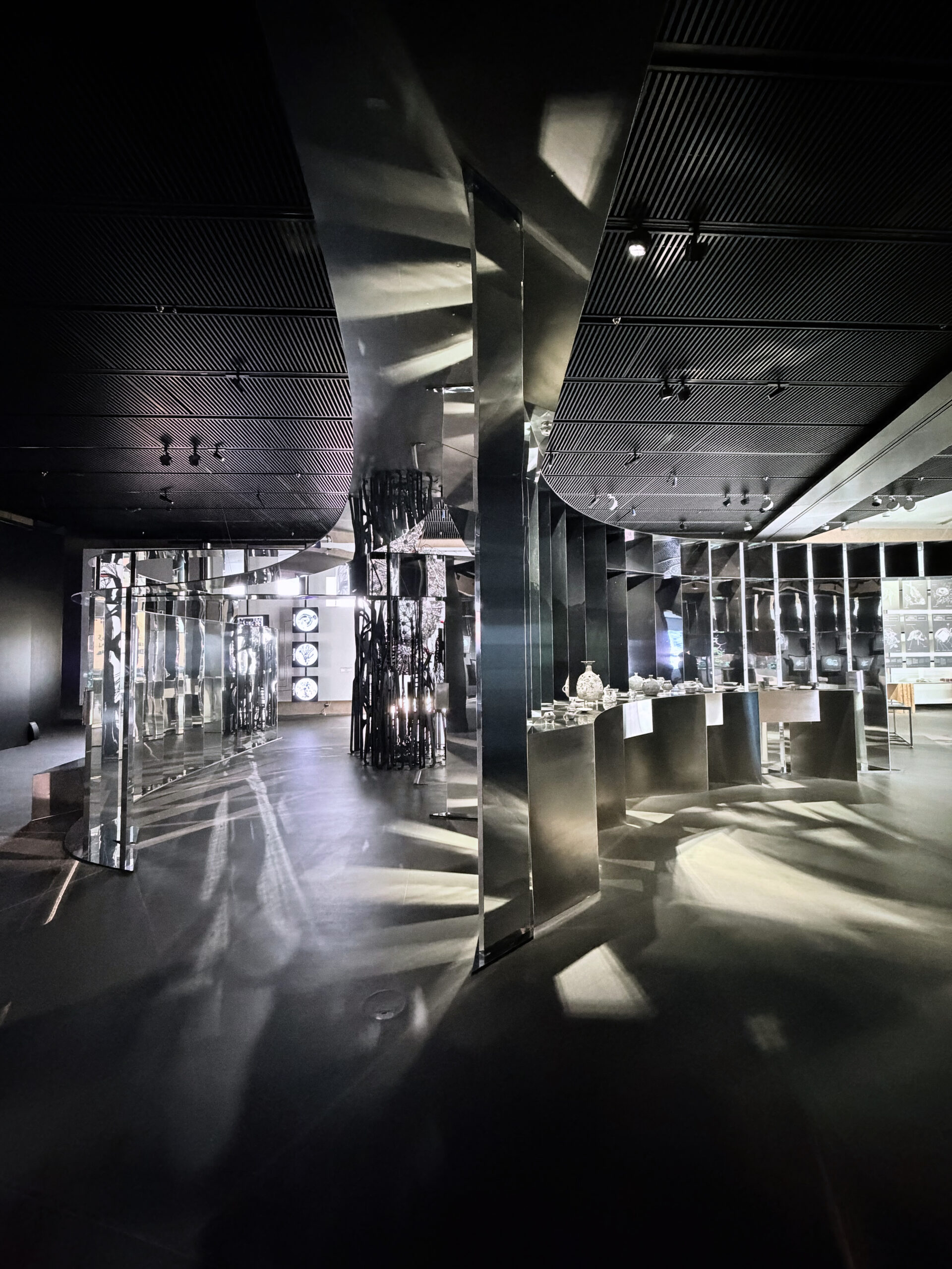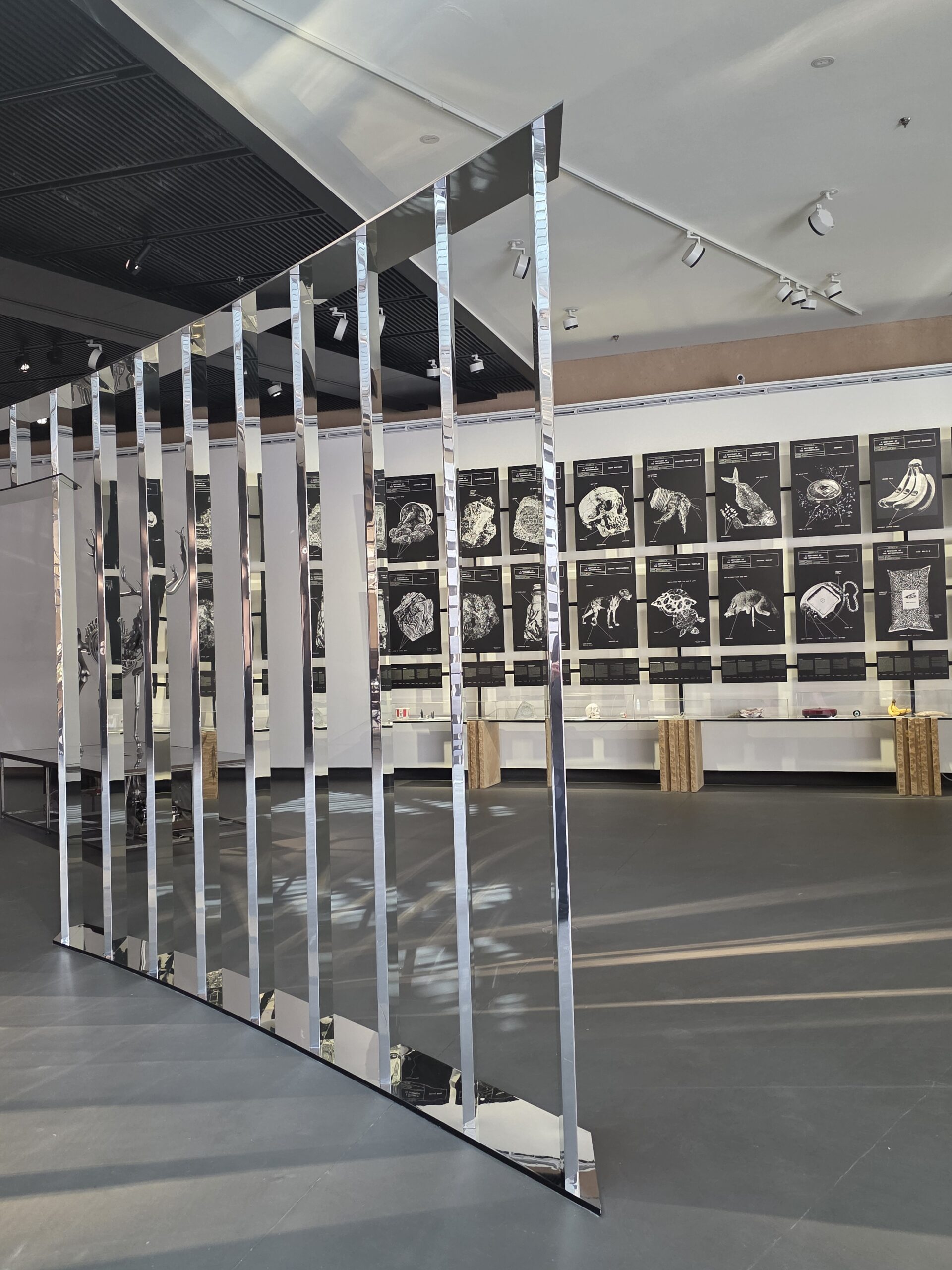 The gallery is conceived as a spatial system in motion, where artwork, audience, and architecture operate as a continuous assemblage. A diaphragm of vertical mirrored fins, arranged in a curvilinear formation, act as a permeable boundary, generating layered reflections and shifting visual fields, guiding movement while maintaining spatial ambiguity. This geometry extends to bespoke scenographic elements, including plinths counterweights, and display cases whose formal rhythm and aesthetic language align with the central structure. Through reflection and repetition, the installation constructs a fluid perceptual field, where architecture transitions from a passive container into an active, mediating presence.