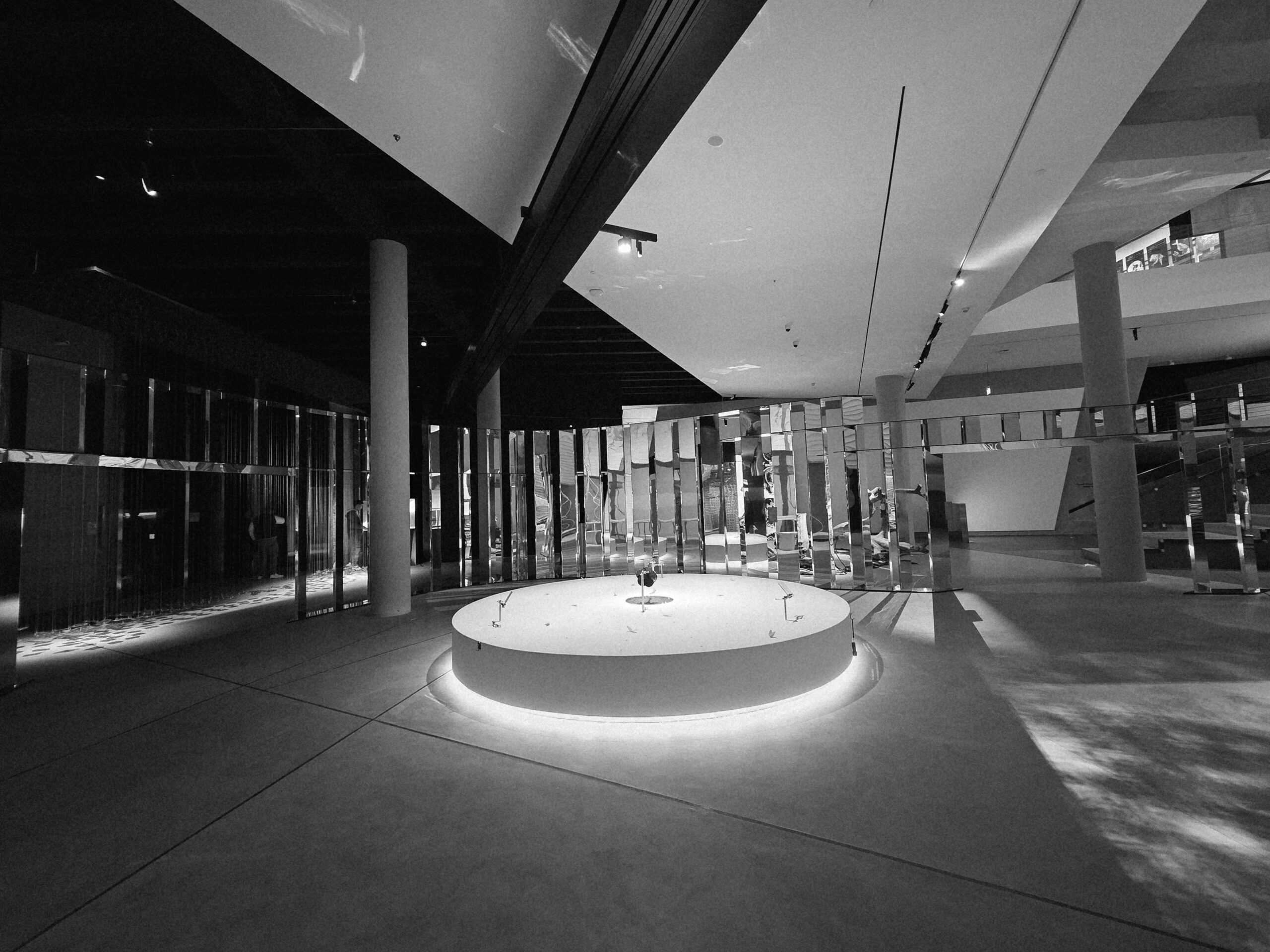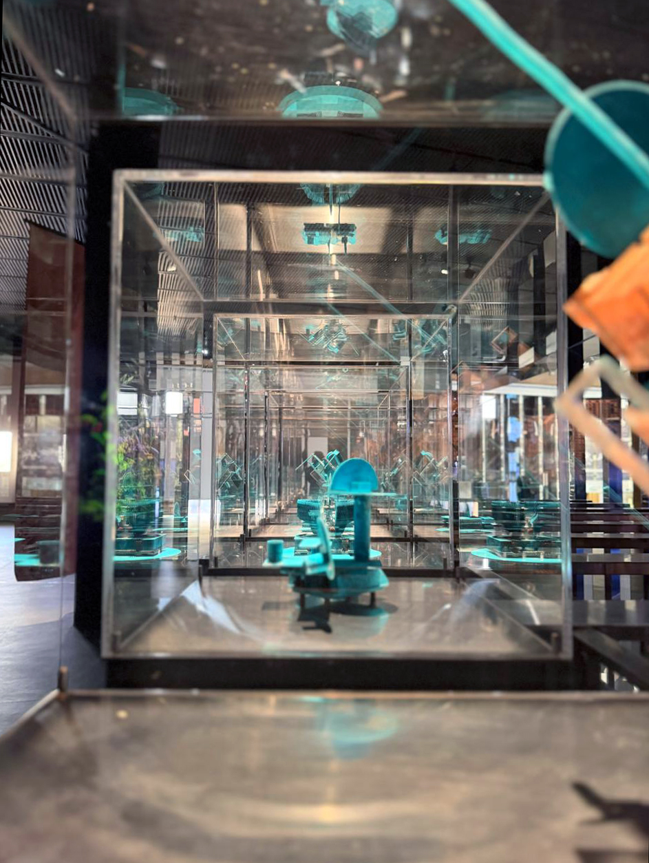 The mirrored diaphragm structures on each floor of the gallery space are complemented by bespoke elements developed for each artwork, following the same aesthetic language and amplifying the interplay of reflections, fragmented vistas, and perceptual assemblages. These elements—comprising seating, benches, plinths, plinth systems, and display cases in brushed inox steel, clear acrylic, and mirrored acrylic—extend the spatial logic of the central system. Operating as mediating devices, they continuously reframe vision, recomposing views between audience, exhibits, and architecture, while collapsing distinctions between observer and observed.