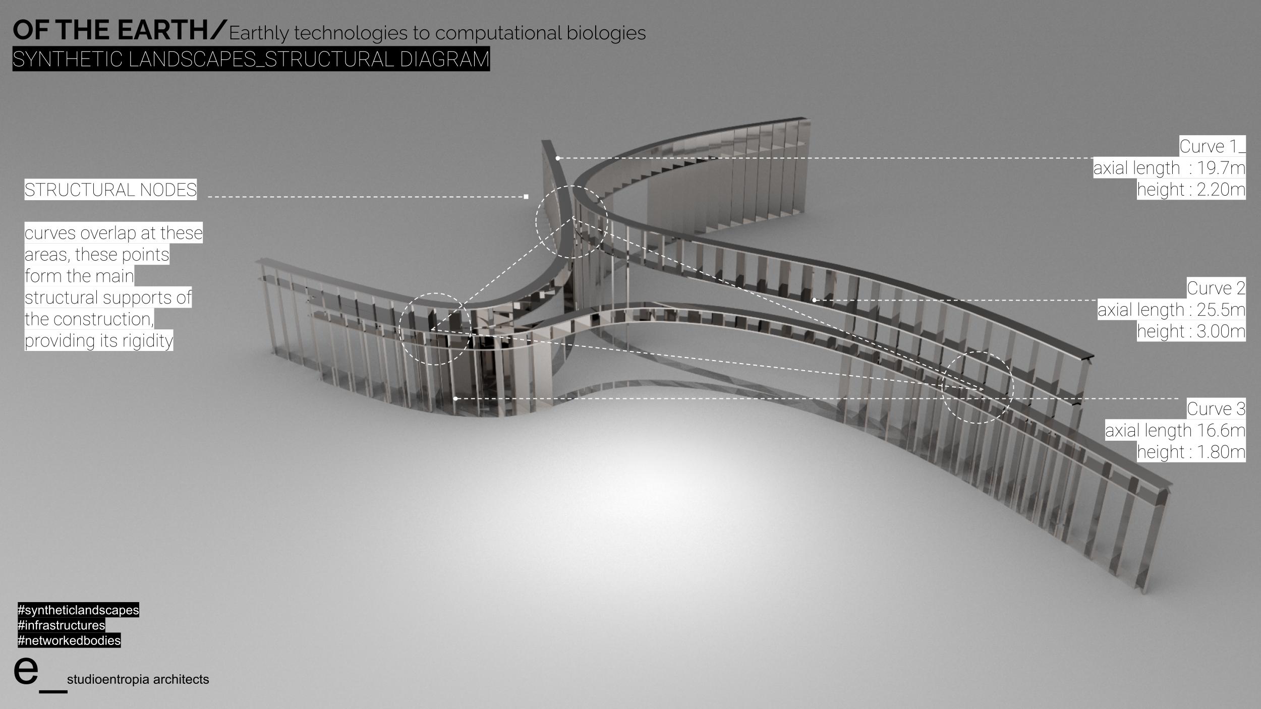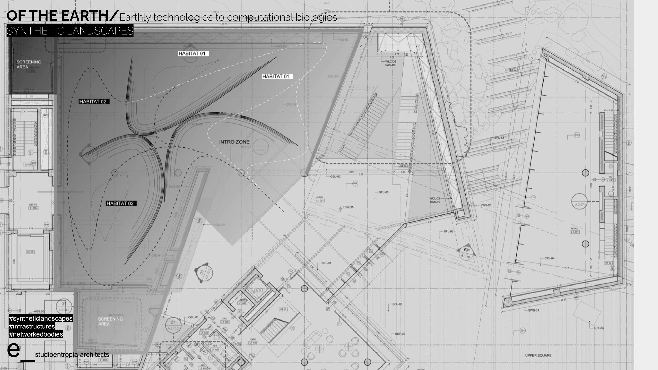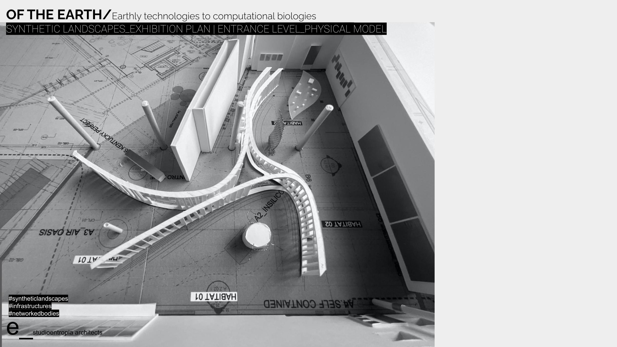 Of The Earth: Earthly Technologies to Computational biologies is an exhibition commissioned by Diriyah Art Futures under the Ministry of Culture Saudi Arabia in Riyadh, curated by Irini-Mirena Papadimitriou.The exhibition design investigates how artificial and organic systems co-evolve, entangle, and reconfigure our understanding of life, agency, and materiality. Inspired by new materialist thinking and post-natural aesthetics, the scenography is a living installation—where machines breathe, plants compute, and visitors become part of the metabolic circuit. The entire exhibition space is conceived as a continuous, constructed landscape—not neutral, but active. It’s a terrain where natural and technological features co-exist, collapse, and recombine. Rather than referencing “nature” as something outside or external, the space becomes its own post-natural landscape—a constructed ecology shaped by reflections, entanglements, and contradictions.