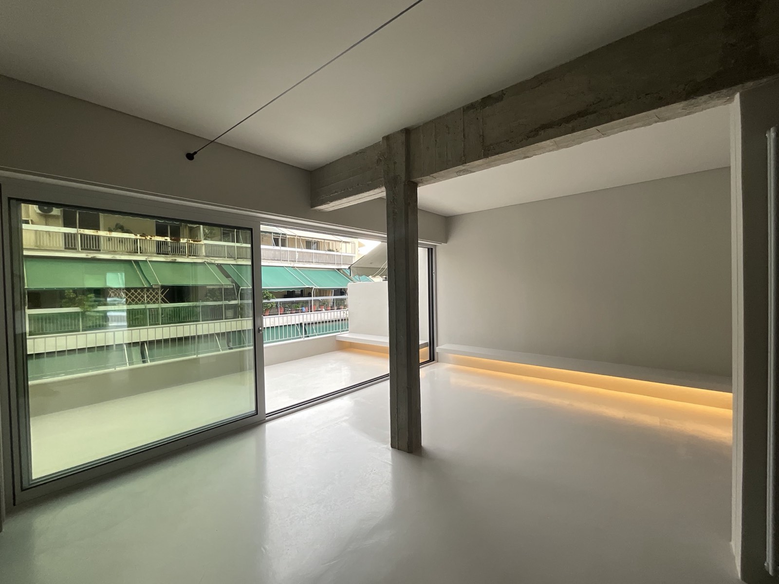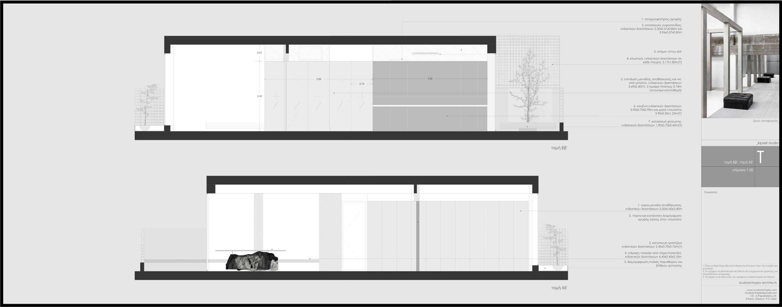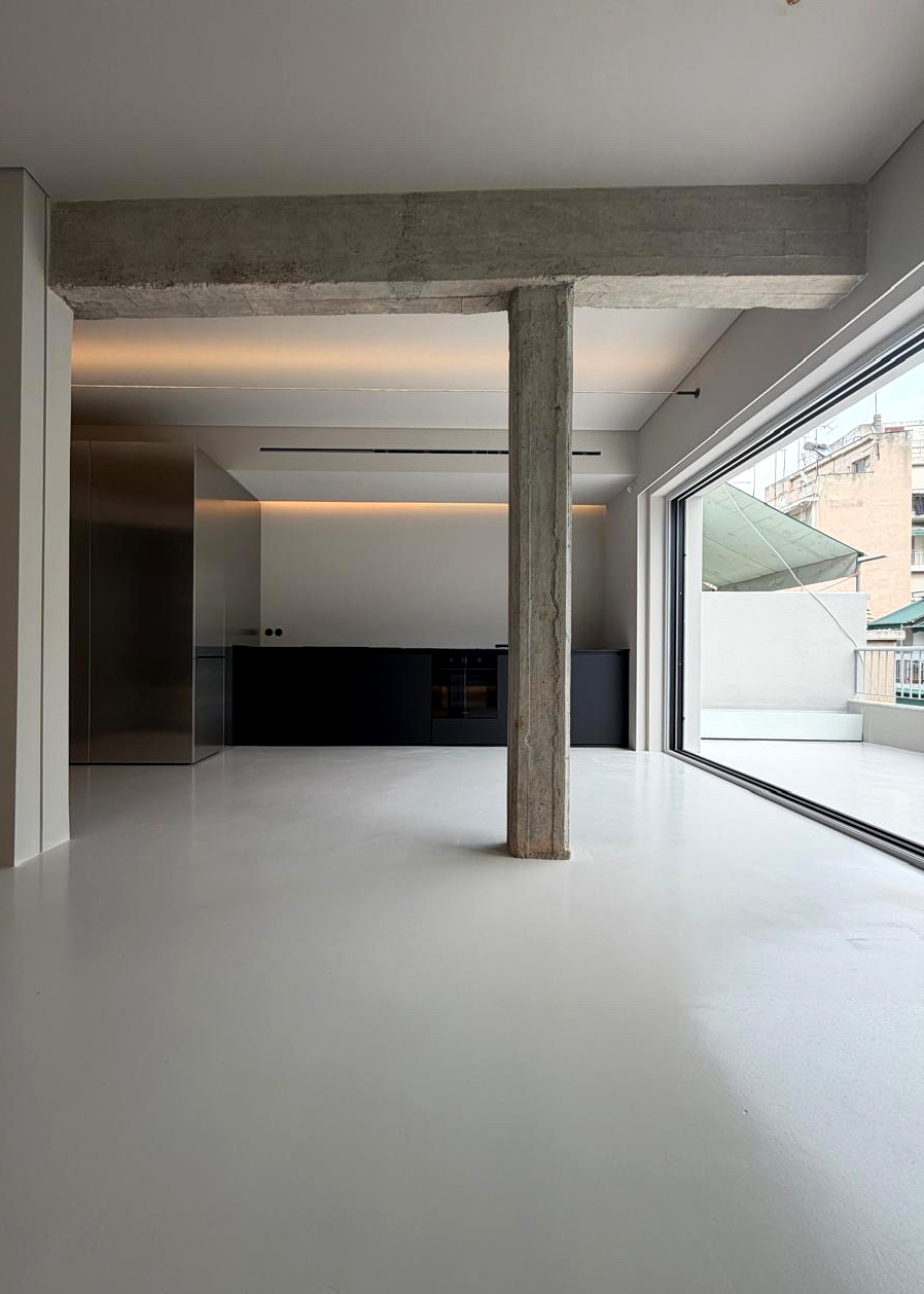The renovation of this 45-square-meter apartment in Athens focuses on maximizing perceived volume through strategic spatial organization and material continuity. To expand the compact footprint, the intervention utilizes spatial techniques that blur the boundaries between interior and exterior, as well as private and public zones. The layout adopts an open-plan format anchored by a central inox-clad volume. Positioned along a lateral axis, this metallic core houses the bathroom and kitchen facilities while reflecting natural light deep into the floor plan. A mirrored pivot door enables spatial reconfiguration, blurring the boundary between the interior and the cityscape when closed, and facilitating transversal views when opened.