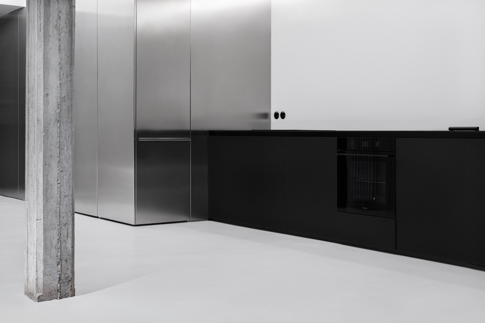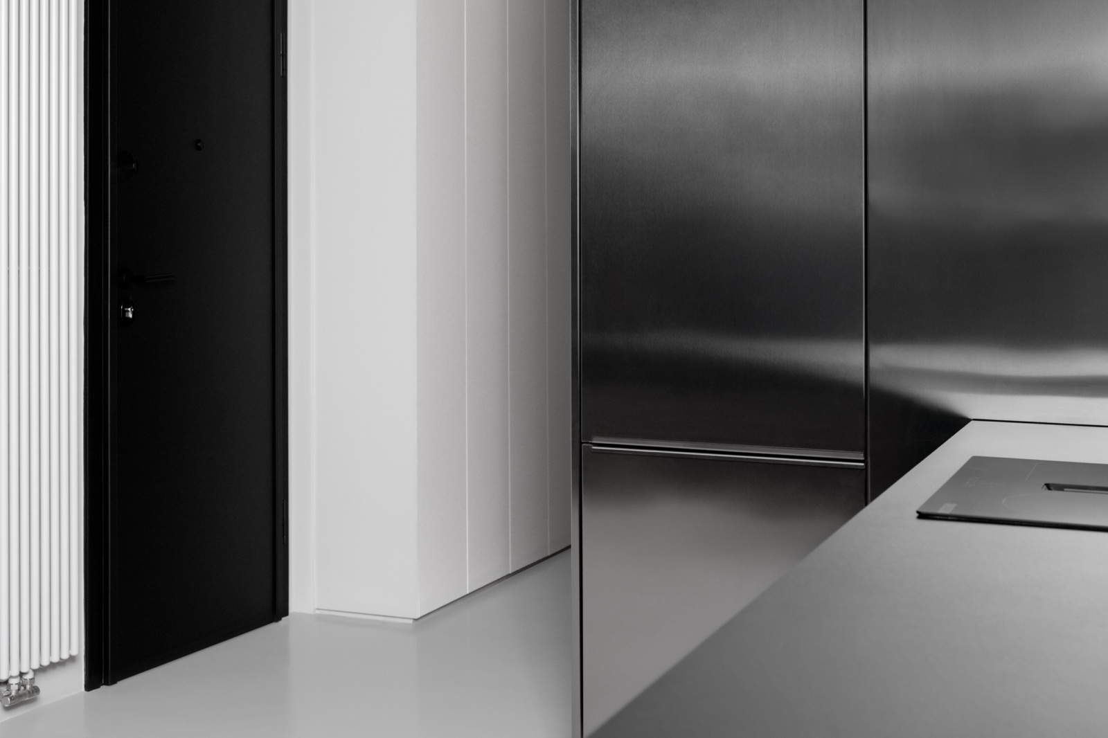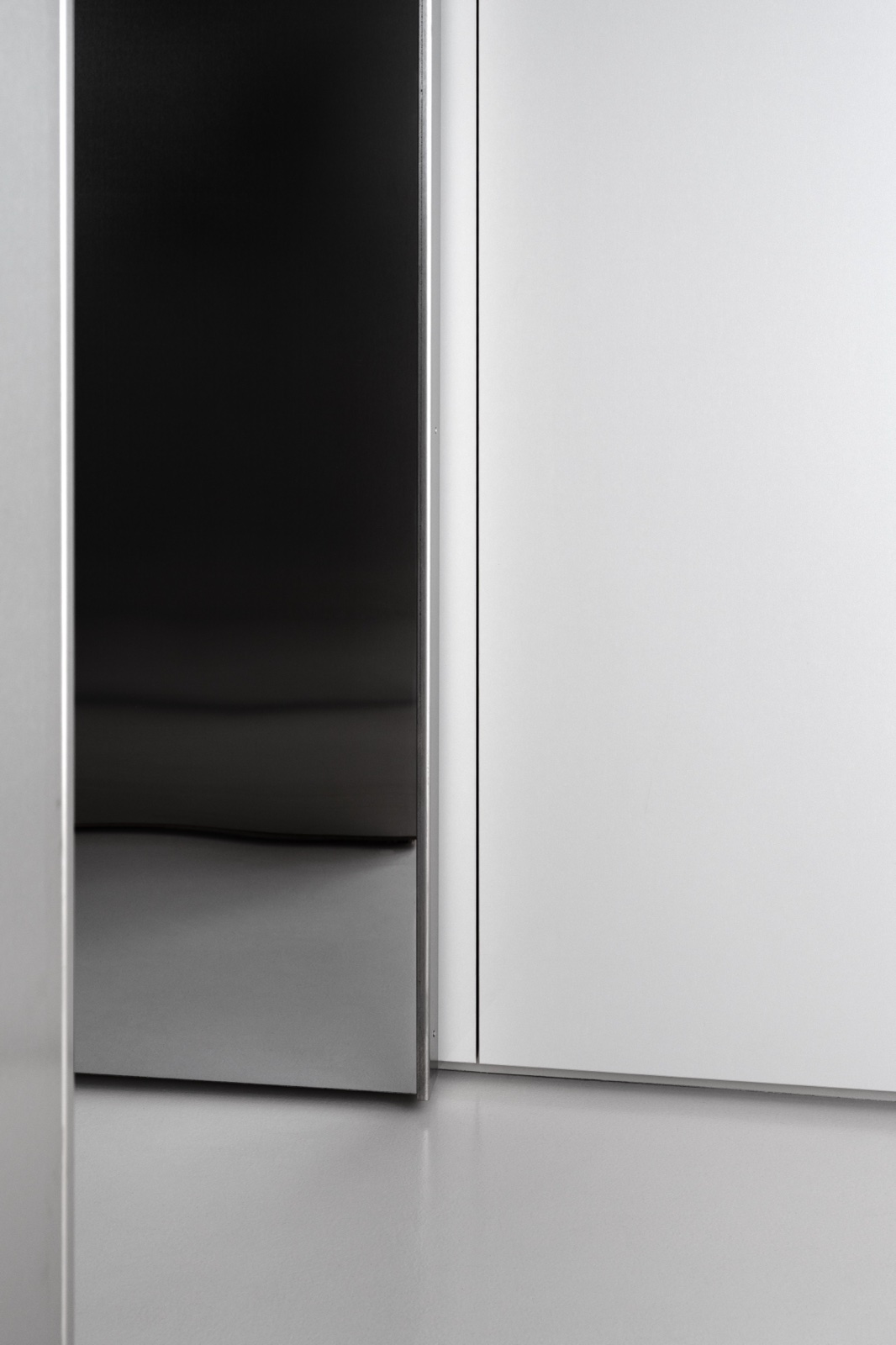 Perceptual strategies are used to amplify the sense of space and extend light into the deepest areas of the apartment, particularly the entrance. A restrained colour palette is carefully calibrated to promote visual continuity, reducing fragmentation and allowing the interior to read as a unified field. The inox-clad volume reflects and redistributes natural light, drawing brightness further inward. The mirrored boundary functions as a reversible spatial device: when open, it allows a fully continuous open-plan layout; when closed, it divides the apartment into two zones while reflecting the surrounding space, maintaining the illusion of openness and visual continuity.